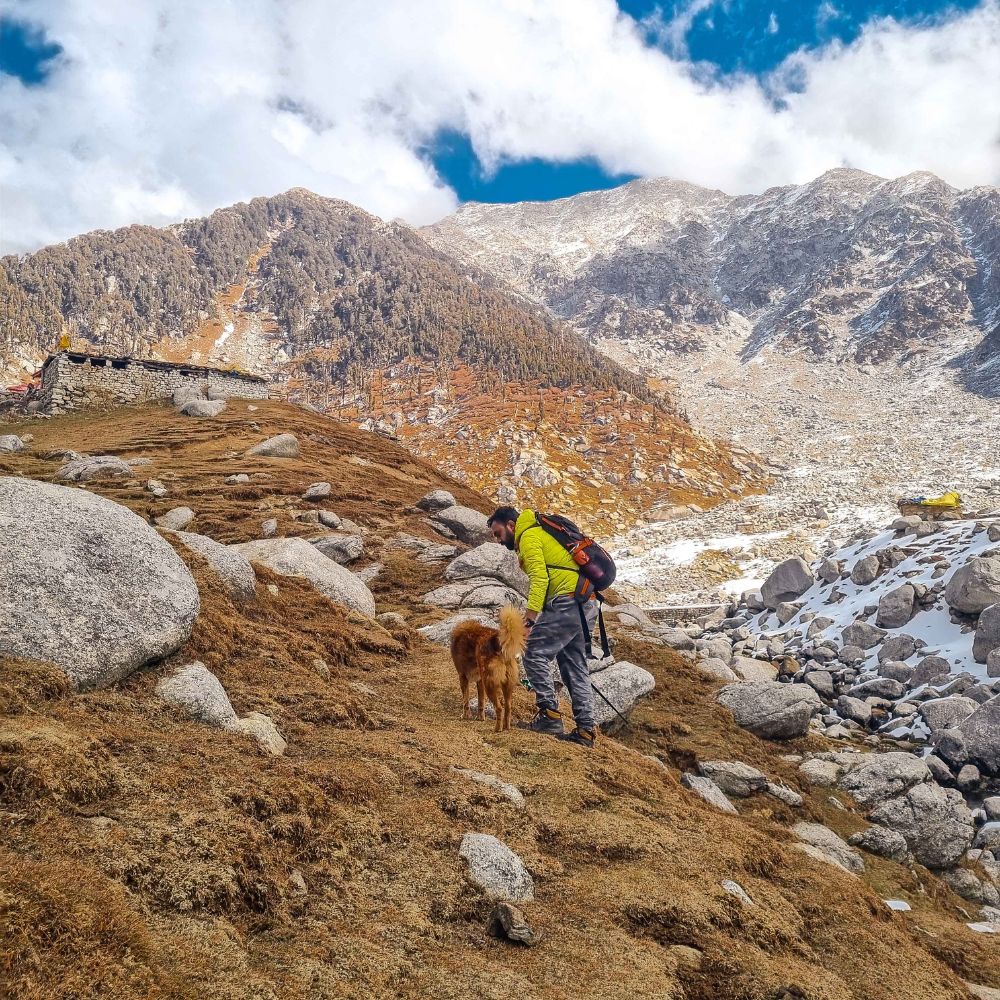 Day2 : Greetings from kareri Lake this morning. We woke up at around 7 AM and ate our breakfast (Aloo k paranthe). We began our journey towards the kareri lake. Kareri lake is approximately 5 kilometers away. A mountain dog accompanies us on the kareri lake trek.